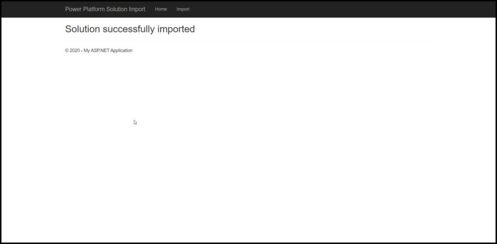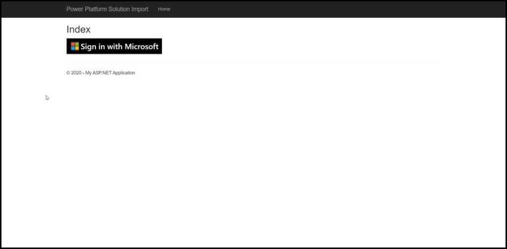 I have created a very simple ASP.NET MVC project, which imports a solution in an environment using the logged in user’s context. The user has to first sign in. After signing in, the user will be able to see a “Import” button in the navigation bar. That button calls a controller method which then handles the import logic, and after importing, the user is shown a message that the solution was successfully imported. I have hard-coded the solution file path in the code.