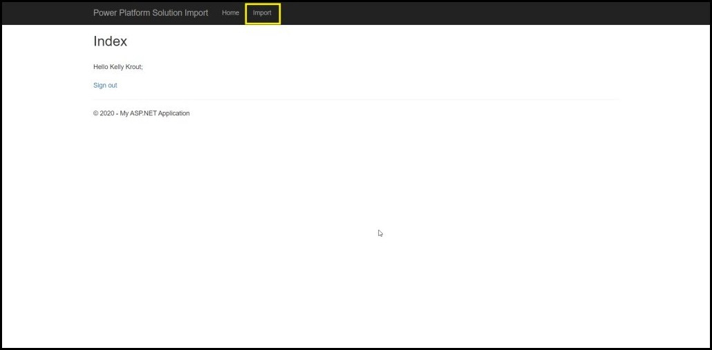 I have created a very simple ASP.NET MVC project, which imports a solution in an environment using the logged in user’s context. The user has to first sign in. After signing in, the user will be able to see a “Import” button in the navigation bar. That button calls a controller method which then handles the import logic, and after importing, the user is shown a message that the solution was successfully imported. I have hard-coded the solution file path in the code.