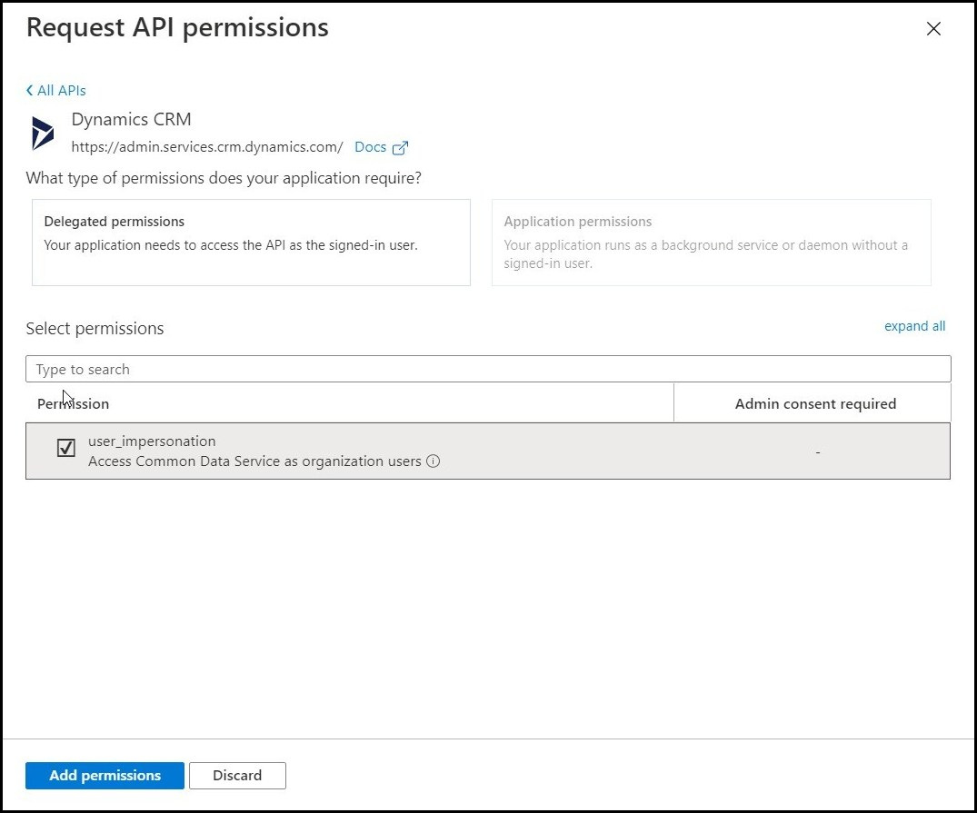 - As you can see, there is only one delegated permission for this API. There are no application permissions. What if I want to manage a solution outside of a user’s context? Refer to the second blog of this series for that use case. For now, let’s just add the “user_impersonation” permission.