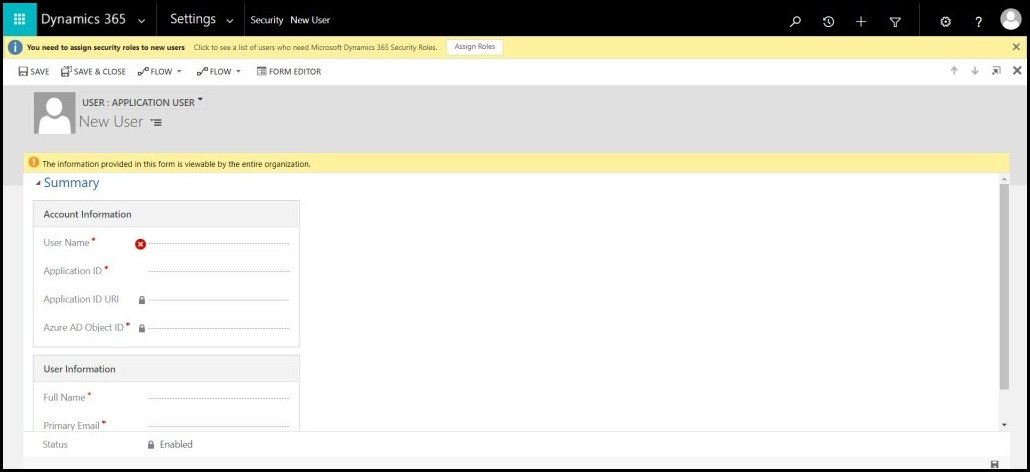 To create an application user, go to Advanced Setting of your environment. Click on Settings drop-down, click on Security -> Users, and then choose Application Users from the drop-down. Create new application user. Add username, full name and email for your new user. For Application ID, enter the client ID of your AAD app.