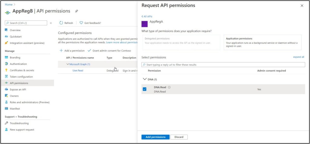 Click on AppRegA. We should now be able to see DNA.Read under application permissions. That means the role which we added in the previous step can now be assigned to applications. Let’s add the permission.