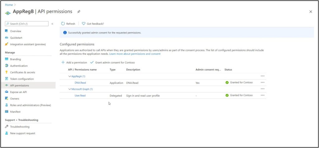 In API permissions page, we can see that AppRegB now contains DNA.Read permission. Awesome! Our API should allow access to AppRegB as it now contains the required permission.