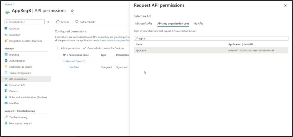 Next let’s setup AppRegB. We want AppRegB to be authorized to access the API. So the only thing we need to do here is add DNA.Read permission to this app. Go to API permissions, click on Add a permission, then search for AppRegA under APIs my organization uses.