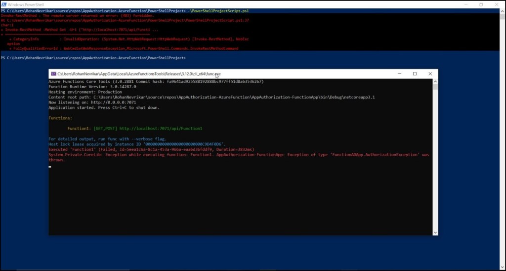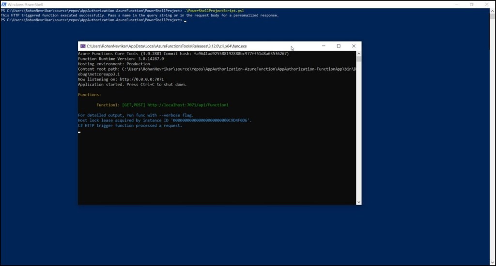 I have written a simple PowerShell script which uses ADAL to generate tokens for an application by accepting clientID and secret. This script will call our API with the generated token. When the API is called using AppRegB’s client credentials, we receive a successful response from the Azure function.