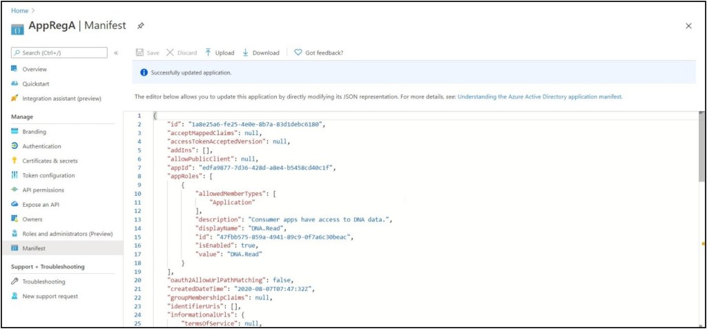 AppRegA will be the one associated with our Azure function. To enforce authorization, we first need to define roles which can be assigned to other applications. To do so, we’ll add app roles in the manifest of AppRegA. I have named this role as DNA.Read, which is the name of the permission which other apps would see. As we want roles to be assigned to applications, we’ll set allowedMemberTypes to Application. Save the changes.