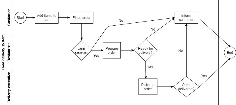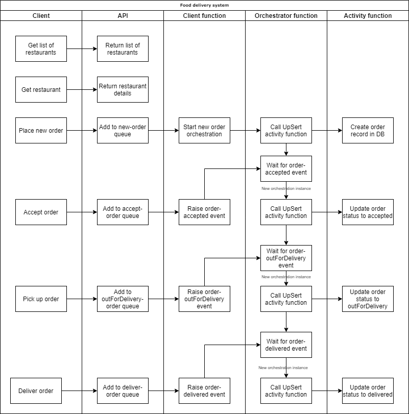 This project covers very basic functionalities of a food delivery platform. It’s main purpose is to manage orders placed by customers. You can find the source code here. A typical flow of such platform will look something like this: